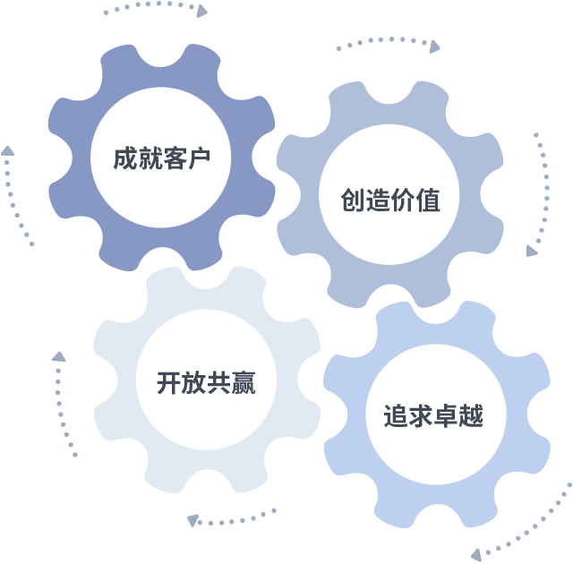 成就客户是一切决策的出发点,,创造价值是衡量所有工作的标准,,,,追求卓越是我们做事做人的态度,,,开放共赢是我们的格局也是最终的结果。。。。价值观的齿轮环环相扣,,,,推动着组织里的每个人不断向前。。。